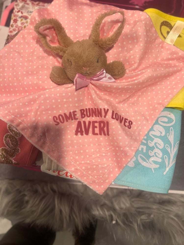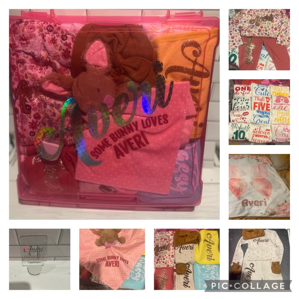 personalized box, 12 milestone onesies, milestone blanket, 2 personalized shirt and pants, pillow, night light 2 bibs stuff animal